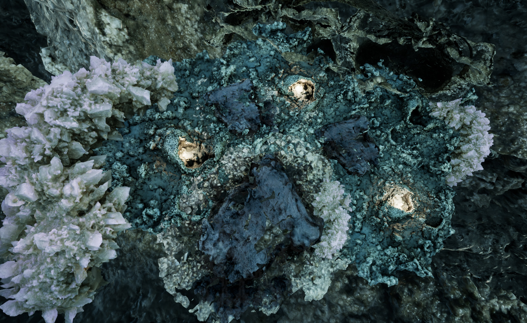 Liminal Lands is a transitional zone where fundamental energies of sun, salt, wind, water and bacteria collide in a hybrid reality. Gathered during over a year of fieldwork in the salt marshes of the Salin de Giraud region in southern France, real photographic and audio elements were digitised and revived in 3D by artist Jakob Kudsk Steensen into a synchronised composition that highlights the otherwise unseen macro-and microscopic ecosystems of the wetlands.