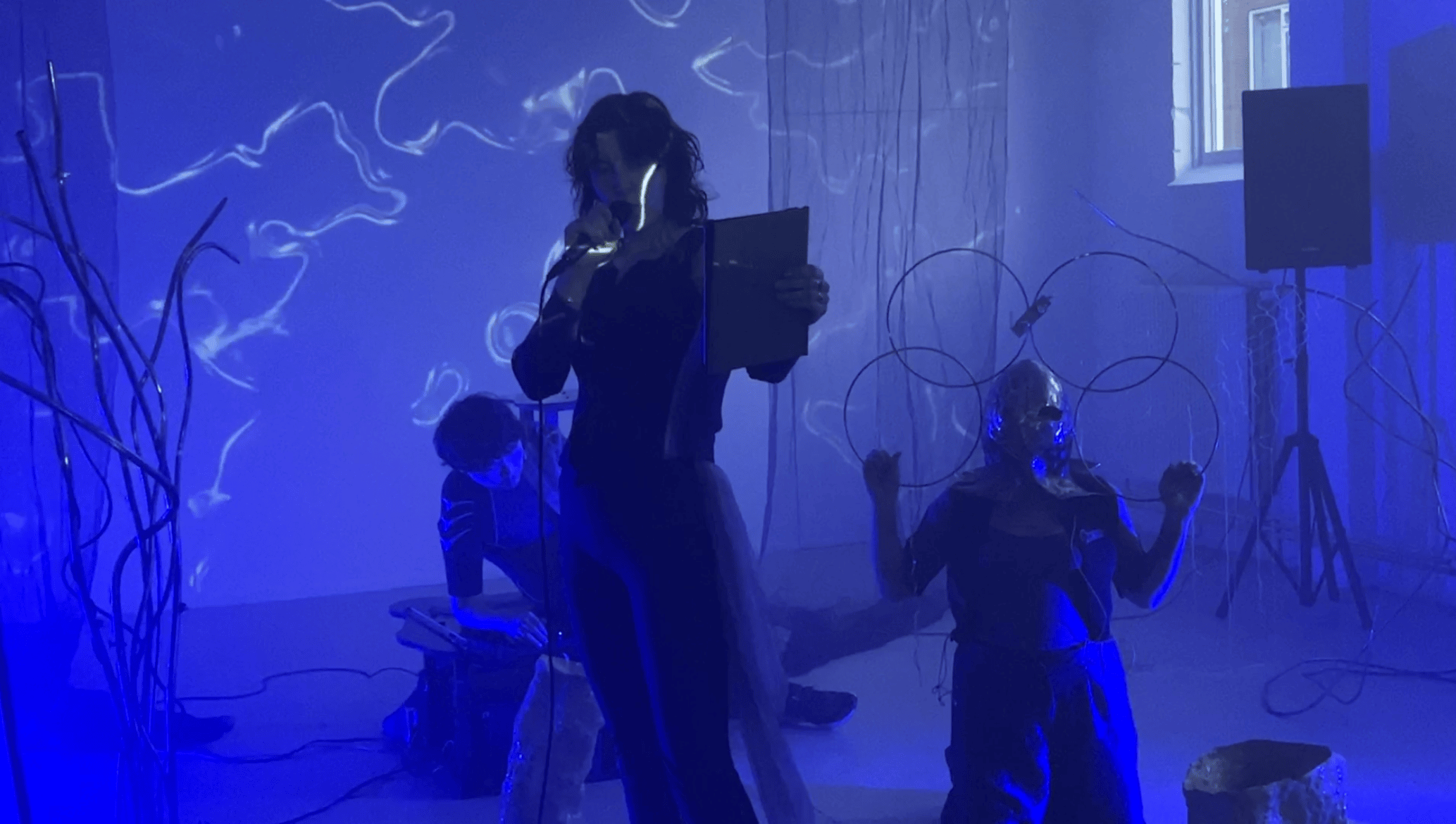 “POTOP, swallow me”, follows the internal and external transformations of Cim, a survivor of a hydro-apocalyptic event. This takes place in a limbo environment, shrouded in mist, moist, malfunctions and murkiness, where Cim embraces the inevitable change from a human to an amphibian creature. Talking to the fish, they begin to understand the importance of multispecies collaboration, deep listening and fluidity. They soak in the depths of an underwater world, rest in the clouds of an ever expanding server and sit on the ground near the swamp, becoming one with everything around them. Cim is a post-human entity, who travels through portals, wifi, energy, water and land in search of connection and the urge to understand human society. *This performance is a continuation of an earlier work, titled, POTOP(flood).